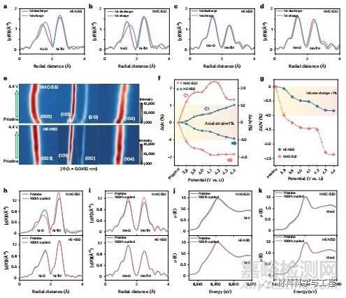 圖2 HE-N50正極在循環(huán)過(guò)程中的結(jié)構(gòu)穩(wěn)定性和體積變化