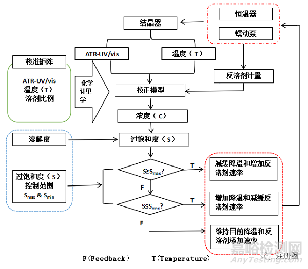 如圖4所示,結晶器內(nèi)先通過溫度計實時檢測原料藥料漿溫度,通過蠕動泵泵入反溶劑,再通過PAT工具(ATR-UV/vis)實時采集料漿光譜數(shù)據(jù),基于前期標定實驗和濃度模型,計算得出料漿溶液濃度,結合原料藥溶解度數(shù)據(jù),得到結晶料液過飽和度(S)情況。再通過對比該飽和度是否在預設范圍的上下限(Smax,Smin),若S≥Smax ,則通過控制器減緩降溫速率和增加反溶劑泵入速率以降低結晶料漿過飽和度至預設區(qū)間;若S≤Smin,則增加降溫速率和減緩反溶劑泵入速率以增加結晶料漿過飽和度至預設區(qū)間;若Smin<S<Smax,即維持在介穩(wěn)區(qū)間,則保持目前的降溫速率和反溶劑泵入速率,總之,始終維持結晶液濃度在介穩(wěn)區(qū)間。