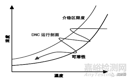 鑒于SFC/CFC控制策略無法直接監(jiān)測結晶過程中晶體屬性的缺陷和不適用于存在較強擾動情況下結晶體系監(jiān)控的局限性,Baker等[14]提出了DNC(直接成核)控制方式,很好的解決了上述問題。DNS運用FBRM(聚焦光束反射測量)原位實時監(jiān)測溶液中顆粒粒數(shù)的變化,對比測量值與目標值之間的差異,運用加熱與冷卻或溶劑與反溶劑添加來回切換的方式,以實現(xiàn)細粒成核或溶解,從而保持體系在預先設定的FBRM監(jiān)測數(shù)量,實現(xiàn)對體系顆粒數(shù)和晶體粒徑的控制。DNC控制方式無需提前清楚結晶模型、過程動力學、介穩(wěn)區(qū)寬度等信息,能夠基于FBRM技術原位實時監(jiān)測結晶體系顆粒數(shù),在結晶過程中連續(xù)自動生成溫度曲線,通過相圖模擬DNC控制軌跡如圖5所示。