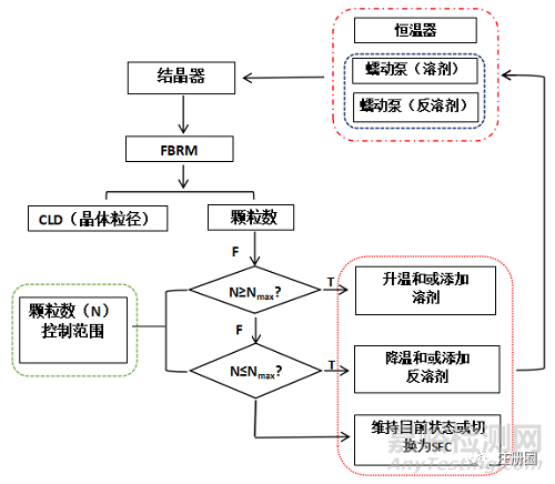 如圖6所示,基于DNC方式的原料藥結晶過程控制,通過FBRM在線實時監(jiān)測結晶器內(nèi)晶體粒徑(CLD)和顆粒數(shù)(Counts N),對比前期預設的顆粒數(shù)上下限(Nmax、Nmin),若N≥Nmax,此時析晶過快,晶體顆粒容易團聚,控制器根據(jù)反饋調控升溫和/或增加溶劑;