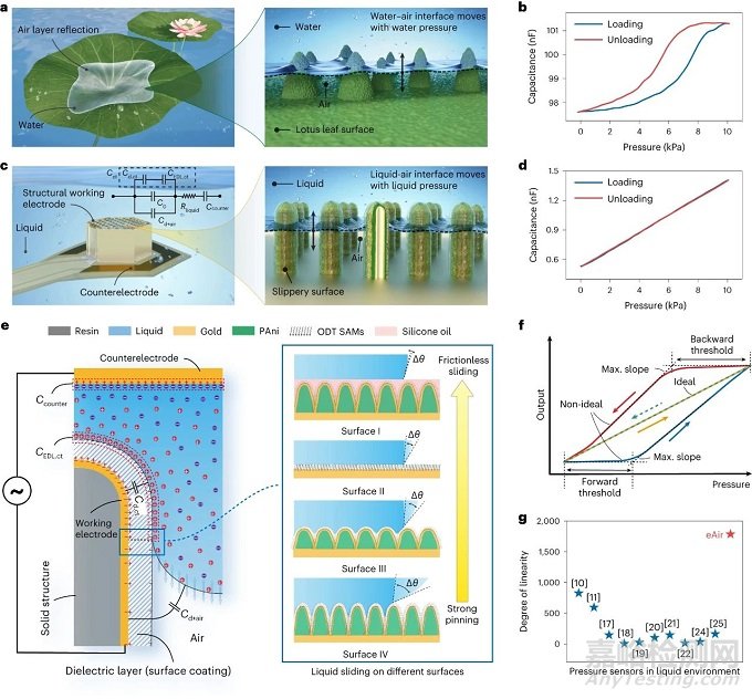 采用創(chuàng)新的“空氣彈簧”設(shè)計,eAir傳感器容納了一個被困的空氣層,在與傳感器的液體接觸時形成氣液界面。隨著外部壓力的增加,這個空氣層被壓縮。表面處理導(dǎo)致傳感器內(nèi)部界面的無摩擦運(yùn)動,觸發(fā)電信號的變化,準(zhǔn)確反映施加的壓力。利用這種設(shè)計,荷葉的天然防水能力被重新設(shè)想為一種簡單而優(yōu)雅的壓力感應(yīng)工具。