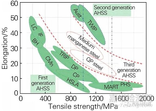 圖1 先進(jìn)高強(qiáng)鋼的伸長(zhǎng)率與抗拉強(qiáng)度關(guān)系[5]