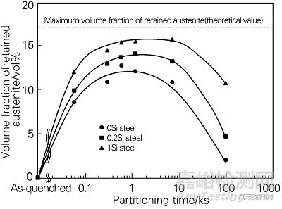 Si元素可以抑制碳化物的析出,使得在配分階段,C元素更多的存在于奧氏體中,穩(wěn)定奧氏體,在室溫下獲得更多的殘留奧氏體。趙暉等[14]研究了Si元素對(duì)中錳Q&P鋼微觀組織和力學(xué)性能的影響,發(fā)現(xiàn)含有Si元素的試驗(yàn)鋼在室溫下的殘留奧氏體含量高,具有較高的抗拉強(qiáng)度和伸長(zhǎng)率,且碳化物較少。Tobata等[15]選取不同Si含量的低碳馬氏體不銹鋼進(jìn)行Q&P工藝處理,發(fā)現(xiàn)隨著Si元素含量增加,殘留奧氏體的體積分?jǐn)?shù)增加,如圖4所示。