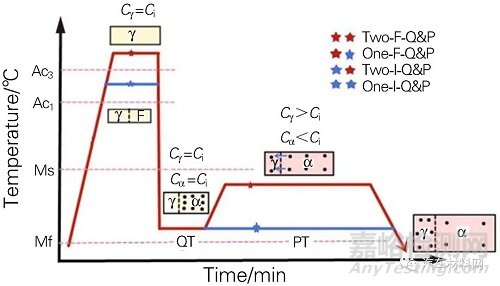 2003年,Speer等[6-7]提出了新型的熱處理工藝——淬火配分(Quenching and Partitioning)工藝,即將鋼加熱到Ac3以上完全奧氏體化的某一溫度下,保溫幾分鐘后淬火至Ms~Mf中的某一溫度TQ,然后進(jìn)行配分,室溫下主要組織為馬氏體和殘留奧氏體。配分可分為一步配分(One step)和兩步配分(Two step),配分溫度等于淬火溫度稱為一步配分,高于淬火溫度稱為兩步配分。淬火工藝是為了形成高強(qiáng)度的馬氏體,配分工藝是為了實(shí)現(xiàn)C從馬氏體向奧氏體的擴(kuò)散,從而提高殘留奧氏體室溫穩(wěn)定性。后來(lái)有學(xué)者提出了在兩相區(qū)加熱,即將加熱溫度控制在Ac1~Ac3之間,從而在馬氏體和殘留奧氏體的基礎(chǔ)上引入鐵素體[8]。圖2為典型Q&P工藝示意圖[9]。