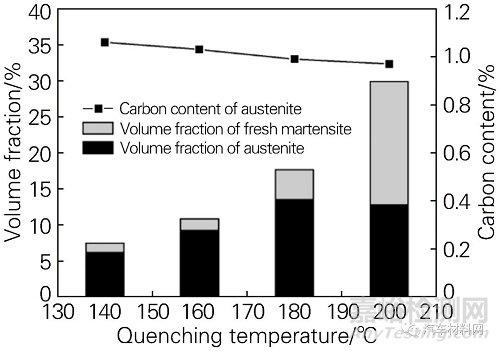 Fig.13 Effect of quenching temperature on volume fraction of retained austenite, fresh martensite and carbon content of austenite[38]