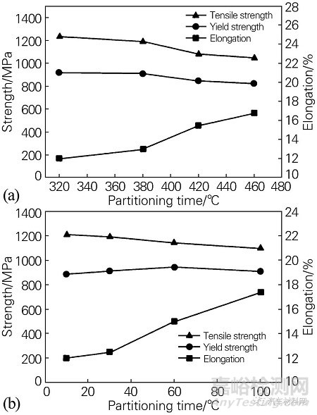 圖15 配分溫度(a)和配分時(shí)間(b)對(duì)Q&P鋼力學(xué)性能的影響[43]