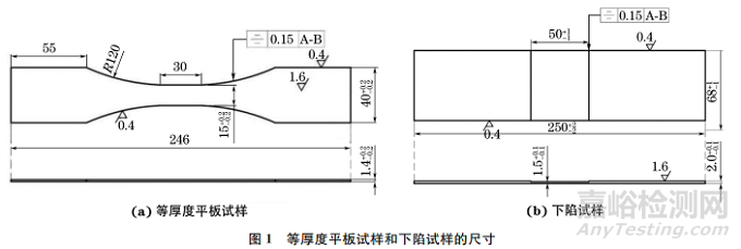 試驗(yàn)材料為厚2mm的2A12-T4鋁合金板,化學(xué)成分如表1所示,熱處理狀態(tài)為固溶+自然時(shí)效,其屈服強(qiáng)度為276MPa,抗拉強(qiáng)度為461MPa,斷后伸長率為13.6%,彈性模量為75GPa。在試驗(yàn)材料上截取尺寸如圖1所示的等厚度平板試樣和下陷試樣,分別采用鏡像銑和化銑工藝對(duì)其進(jìn)行加工。
