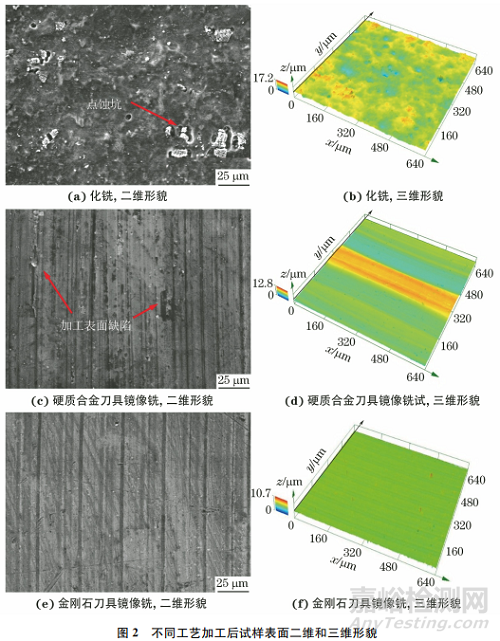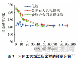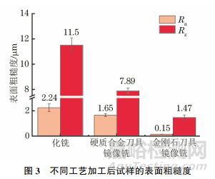 由圖3可見,化銑試樣的表面粗糙度最大,硬質(zhì)合金刀具鏡像銑試樣次之,金剛石刀具鏡像銑試樣的表面粗糙度最小,表面粗糙度測試結(jié)果與表面形貌觀察結(jié)果一致。金剛石刀具鏡像銑試樣的Ra分別比化銑試樣和硬質(zhì)合金刀具鏡像銑試樣降低了93.3%和90.9%,Rz分別降低了87.2%和81.4%。