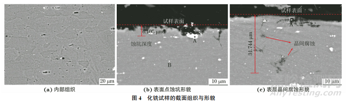 由圖4可知:2A12-T4鋁合金組織中析出CuAl2和Al2CuMg強(qiáng)化相;化銑試樣表面產(chǎn)生了深度約為10μm的點(diǎn)蝕坑,表層出現(xiàn)晶間腐蝕。微觀腐蝕不均勻?qū)е禄娫嚇颖砻姘纪共黄?,粗糙度較大。EDS分析發(fā)現(xiàn),化銑試樣表面點(diǎn)蝕坑底部(位置A)存在陰極析出的CuAl2相,即點(diǎn)蝕坑的形成是微電池促進(jìn)局部腐蝕的結(jié)果。而晶間腐蝕(位置B)則是晶界析出相與無沉淀析出帶及晶粒構(gòu)成的微電池造成的晶間局部加速腐蝕的結(jié)果?;姴垡褐刑砑恿蚧{可在一定程度上抑制點(diǎn)腐蝕和晶間腐蝕,但并不能根除這類局部腐蝕。