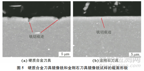 由圖5可以看出,鏡像銑試樣表層組織未發(fā)生明顯變化,硬質(zhì)合金刀具鏡像銑試樣表面存在機(jī)械加工的銑切缺口,而金剛石刀具鏡像銑試樣表面較平整,銑切痕跡較淺。