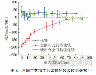 由圖6可以看到:化銑試樣表層存在較低的殘余拉應(yīng)力,這可能是化銑腐蝕過程造成的表面缺陷及組織結(jié)構(gòu)變化導(dǎo)致的;硬質(zhì)合金刀具鏡像銑試樣表層存在較低的殘余拉應(yīng)力,分布在距表面約55mm范圍,此后轉(zhuǎn)變?yōu)檩^低的殘余壓應(yīng)力;金剛石刀具鏡像銑試樣表層存在較大的殘余壓應(yīng)力,隨