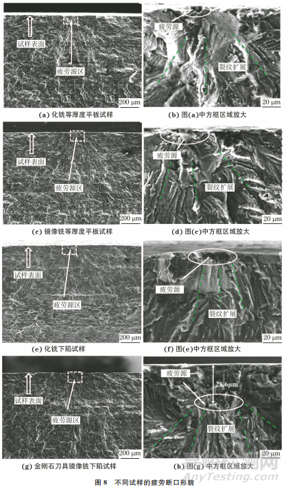 由圖8可以看出:化銑等厚度平板試樣的疲勞裂紋均起源于化銑表面點(diǎn)蝕坑缺陷處,該區(qū)域應(yīng)力集中嚴(yán)重;化銑下陷試樣疲勞裂紋在下陷臺(tái)階過渡角部位表面萌生,該區(qū)域疊加了點(diǎn)蝕坑和過渡角處的應(yīng)力集中效應(yīng);裂紋源區(qū)均呈現(xiàn)準(zhǔn)解理斷裂特征,裂紋從源區(qū)向內(nèi)部呈放射狀擴(kuò)展。鏡像銑等厚度平板試樣的疲勞裂紋在硬質(zhì)合金刀具加工的表面刀痕溝槽底部萌生,該區(qū)域應(yīng)力集中嚴(yán)重;鏡像銑下陷試樣的疲勞裂紋在下陷臺(tái)階過渡角部位次表層萌生,這與該試樣表面存在殘余壓應(yīng)力密切相關(guān);裂紋源區(qū)均呈現(xiàn)準(zhǔn)解理斷裂特征,裂紋從源區(qū)向內(nèi)部呈放射狀擴(kuò)展。所有試樣的裂紋擴(kuò)展區(qū)和瞬時(shí)斷裂區(qū)微觀形貌無明顯差異,因?yàn)檫@2個(gè)區(qū)域不受表面加工狀態(tài)的影響。裂紋擴(kuò)展區(qū)均為準(zhǔn)解理穿晶斷裂特征,瞬時(shí)斷裂區(qū)則為韌窩狀塑性斷裂特征。