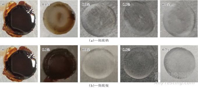 分別將鉬酸鈉和鉬酸銨添加到乳液中,考察兩者對防閃銹性的影響,結(jié)果如圖1所示。