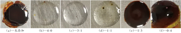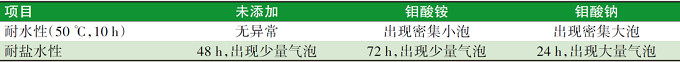 從表3可以看出,添加鉬酸銨和鉬酸鈉均使漆膜的耐水性變差,都發(fā)生了起泡,與鉬酸銨相比,由于鉬酸鈉的電離程度更高,因此水的滲透速度也更快,起的泡也會更大。鹽水浸泡的結(jié)果同樣顯示了添加鉬酸鈉的漆膜由于電離程度高,導(dǎo)致其在24 h時就出現(xiàn)大量的氣泡。