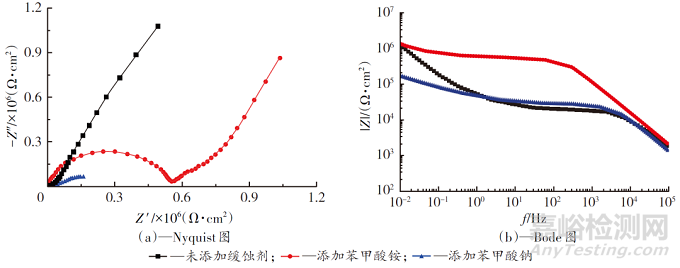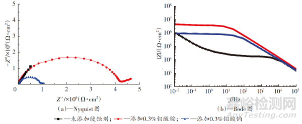 圖8是添加了上述比例緩蝕劑的漆膜在鹽水中浸泡72 h后測得的電化學(xué)阻抗譜。