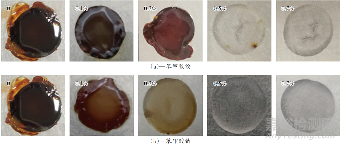 苯甲酸鹽因其環(huán)保性和緩釋作用,常被用來與亞硝酸鈉復(fù)配制備防閃銹劑。本實驗將苯甲酸銨和苯甲酸鈉分別添加到乳液中,考察兩者對漆膜防閃銹性的影響,實驗結(jié)果如圖3所示。