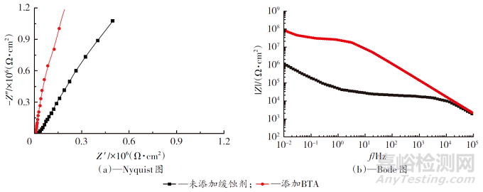 從圖6(a)可以看出,添加BTA的漆膜在高頻區(qū)的容抗弧直徑比未添加的大,這是因為BTA的緩蝕作用提升了漆膜的防腐效果。漆膜在浸泡72 h后均出現(xiàn)了擴(kuò)散的斜線,此時漆膜表面已經(jīng)起泡。由圖6(b)可以看出,添加BTA的漆膜在0.01 Hz的阻抗大約為108 Ω·cm2,而未添加緩蝕劑的漆膜在0.01 Hz的阻抗為106 Ω·cm2左右,可見添加BTA提升了漆膜耐腐蝕性。