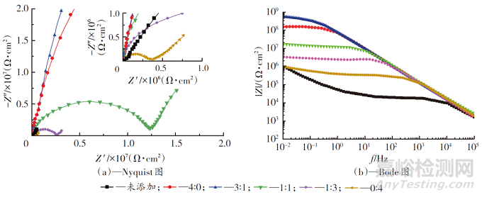 Fig. 8 Impedance spectra of paint films with different proportions of corrosion inhibitor
