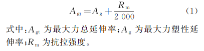 試驗(yàn)開(kāi)始前,使用標(biāo)距打點(diǎn)機(jī)在試樣上標(biāo)記原始標(biāo)距,標(biāo)記間距為10mm。引伸計(jì)的標(biāo)距為100mm。試驗(yàn)時(shí),將引伸計(jì)裝夾在試樣的中間位置,過(guò)了最大力后,將引伸計(jì)卸下;隨后試驗(yàn)機(jī)繼續(xù)加載,直至試樣完全斷裂。取其中較長(zhǎng)一段試樣,用手工法測(cè)試其最大力總延伸率,測(cè)試時(shí),原始標(biāo)距為100mm,計(jì)算方法如式(1)所示。