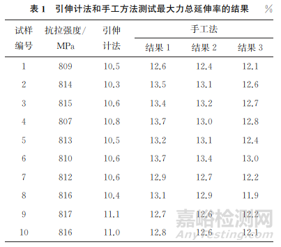 表1為采用引伸計(jì)法和手工法測(cè)試最大力總延伸率的結(jié)果,其中手工法獲得的結(jié)果1~3分別為從距離斷口50mm的位置開(kāi)始,每次距離增加10mm的測(cè)試結(jié)果。由表1可知:采用引伸計(jì)法測(cè)試最大力總延伸率的結(jié)果較為穩(wěn)定,10支試樣的極差為0.8%,引伸計(jì)在試驗(yàn)時(shí)能夠較好地跟蹤試樣的變形情況;手工法測(cè)試最大力總延伸率的結(jié)果波動(dòng)較大,結(jié)果1~3的極差都大于1.0%;手工法測(cè)試結(jié)果要大于引伸計(jì)法測(cè)試結(jié)果;采用手工法進(jìn)行測(cè)試,與斷口的距離越小,最大力總延伸率的測(cè)試結(jié)果越大。