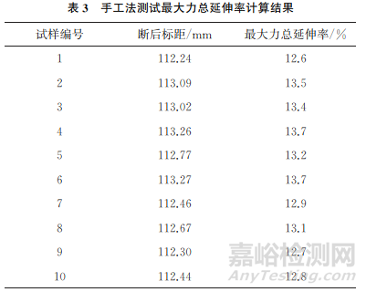 試樣斷裂后,在距離斷口50mm的位置,以100mm的標(biāo)距長(zhǎng)度進(jìn)行測(cè)試,10支試樣測(cè)試結(jié)果如表3所 示,其中斷后標(biāo)距的算術(shù)平均值為112.752mm,相對(duì)標(biāo)準(zhǔn)偏差為0.346%;最大力總延伸率的算術(shù)平均值為13.160,相對(duì)標(biāo)準(zhǔn)偏差為3.086%。