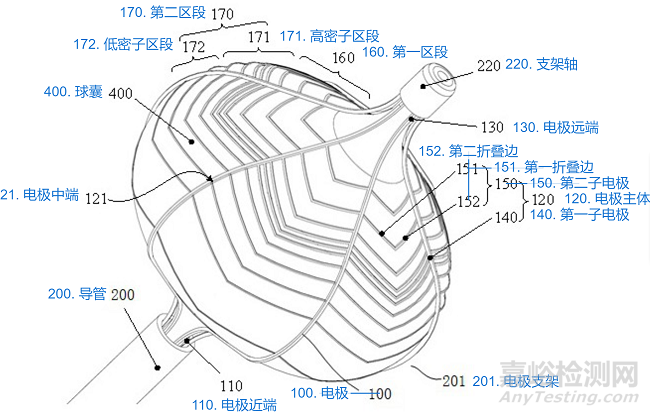 四是脈沖消融導(dǎo)管設(shè)備的電極支架包括網(wǎng)狀的電極主體,網(wǎng)狀結(jié)構(gòu)可以提供連續(xù)的貼靠,具有更大的電極表面積和更低的熱效應(yīng);并且對球囊填充冷卻介質(zhì)一方面能夠提供電極的冷卻功能,消除電極產(chǎn)生熱效應(yīng),另一方面可以支撐電極,使電極能夠更好的貼靠到組織。