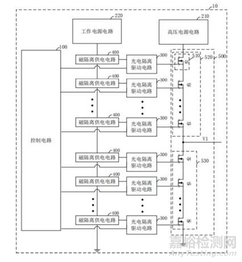 與現(xiàn)有技術(shù)相比存在的有益效果是:本申請通過上述的光電隔離驅(qū)動電路和磁隔離供電電路可以實現(xiàn)功率開關(guān)、高壓電源電路、工作電源電路和控制電路之間的隔離,尤其能夠?qū)崿F(xiàn)高壓電源電路與其他電路之間的隔離,使各個功率開關(guān)可以獨立控制,不受高壓電源電路的影響。同時光電隔離驅(qū)動電路具有更快的響應(yīng)速度,通過光電隔離驅(qū)動電路根據(jù)開關(guān)控制信號對功率開關(guān)進(jìn)行控制,在實現(xiàn)電氣隔離的同時能夠提高各個功率開關(guān)的同步率。