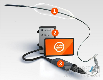 IVL球囊導管系統(tǒng)主要由以下三部分組成,1:帶電極的球囊導管--起治療作用;2:體外脈沖發(fā)生器--向球囊內(nèi)部的電極提供脈沖能量;3:連接電纜--連接球囊導管和脈沖發(fā)生器:,下圖為IVL產(chǎn)品效果圖: