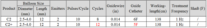Shockwave冠脈IVL產(chǎn)品有兩款,其中C2在2022年登錄國內(nèi)市場,第二代C2+目前還未引進國內(nèi),估計也快了;從其基本信息來看,第二代 C2+適配的GC降低成5F,說明C2+產(chǎn)品整體的通過外徑相對于C2來講有所下降,再者是C2+提高了最大脈沖次數(shù),由C2的80 pulses提高到C2+的120 pulses,使得處理鈣化更嚴重的病變成為了可能;