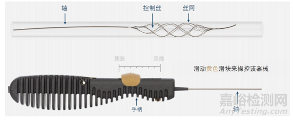該產(chǎn)品的目的是局部捕獲腦血栓然后將其取出,重建血流。產(chǎn)品結(jié)構(gòu)示意如下圖 1。該產(chǎn)品是在射線透視下,通過(guò)微導(dǎo)管將其輸送至病變部位,然后釋放編織絲網(wǎng)至目標(biāo)血管中的血栓處。該產(chǎn)品的絲網(wǎng)在出微導(dǎo)管時(shí)能夠保持其未出微導(dǎo)管時(shí)的收縮尺寸。當(dāng)編織絲網(wǎng)的位置確定時(shí),術(shù)者可通過(guò)手柄使編織絲網(wǎng)膨脹開(kāi)。編織絲網(wǎng)的直徑和徑向支撐力可通過(guò)滑動(dòng)手柄上的滑塊調(diào)節(jié)。嵌栓完成后,術(shù)者在回撤時(shí)可適度收縮編織絲網(wǎng),預(yù)期降低徑向支撐力來(lái)減少對(duì)血管的損傷。編織絲網(wǎng)的閉合末端預(yù)期減少遠(yuǎn)端栓塞的風(fēng)險(xiǎn)。編織絲網(wǎng)的每根絲都含鉭芯,預(yù)期增加可視性。