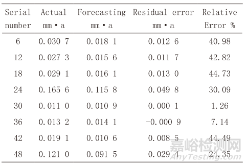 圖2為GRNN模型光滑因子Spread值分別為不同時的RE及MAPE,由圖中可以看出,PCA-GRNN模型的GF隨著光滑因子的增加而減弱,這表明了光滑因子越大,PCA-GRNN對建模樣本的擬合度則越差;MAPE隨著光滑因子的增加表現(xiàn)出先下降后上升的趨勢,當光滑因子小于0.5時,其MAPE基本一致,皆為31.26%,表現(xiàn)出較好且穩(wěn)定的預(yù)測性能;當光滑因子為0.8時,其MAPE最低,為29.49%;這表明了PCA-GRNN模型與PCA-BPNN模型一樣,其GF與MAPE并沒有表現(xiàn)出明顯的相關(guān)性。表7為光滑因子為0.8時,GRNN模型的預(yù)測結(jié)果,由表7中可以看出,GRNN模型的相對誤差基本在(30%,45%)區(qū)間內(nèi),還有兩個數(shù)值的相對誤差低于10%。因此,PCA-GRNN模型的預(yù)測精度更高,能夠更為準確地預(yù)估鋁合金在模擬南海熱帶大氣環(huán)境下的腐蝕速率,預(yù)測結(jié)果更為可靠。