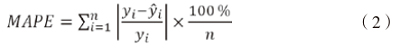 選用平均絕對百分比誤差(mean absolute percent error, MAPE)指標來評估模型的預(yù)測性能。計算公式為:
