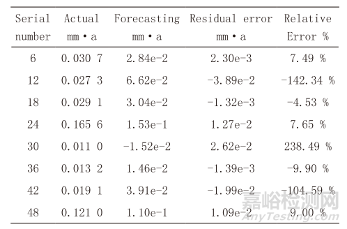 由圖1和圖2可以看出,構(gòu)建了10次PCA-BRNN模型的MAPE最小值為60.91%,最大值為136.54%,而PCA-GRNN模型的MAPE都在30%左右。由表6和表7可以看出,MAPE最低的PCA-BPNN模型的預(yù)測結(jié)果中,五組數(shù)據(jù)的RE低于10%,三組數(shù)據(jù)的RE高于100%,而MAPE最低的PCA-GRNN模型的預(yù)測結(jié)果中,僅兩組數(shù)據(jù)的RE低于10%,其余數(shù)據(jù)的RE均在45%以內(nèi)。這表明PCA-GRNN模型的部分數(shù)據(jù)的預(yù)測精度低于PCA-BPNN,但其預(yù)測精度的穩(wěn)定性遠優(yōu)于PCA-BPNN,因此,PCA-GRNN比PCA-BPNN更加適合鋁合金模擬南海熱帶海洋大氣腐蝕的建模研究。