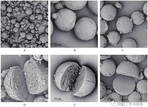 圖,×5000 倍,加速電壓10 kV,比例尺10 μm) ;E—注射用利培酮微球(剖面圖,×6800 倍,加速電壓5 kV,比例尺10 μm) ;