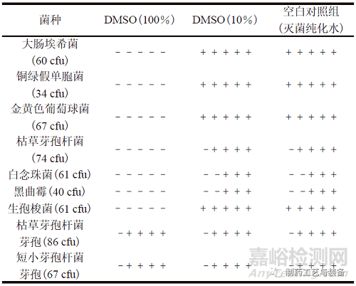 分別取“2.2”項(xiàng)下100% DMSO(高濃度)、10% DMSO 溶液(低濃度) 適量,依照ChP 2020通則1101,分別加入不大于100 cfu 的各試驗(yàn)菌懸液,混勻。將含有大腸埃希菌、銅綠假單胞菌、金黃色葡萄球菌和生孢梭菌的混合溶液轉(zhuǎn)移至FTM培養(yǎng)基50 ml 中,于33 ℃培養(yǎng)不少于5 d,將含有枯草芽孢桿菌、白念珠菌、黑曲霉、枯草芽孢桿菌芽孢和短小芽孢桿菌芽孢的混合溶液轉(zhuǎn)移至TSB培養(yǎng)基50 ml 中,于23 ℃培養(yǎng)不少于5 d。結(jié)果如表1所示,100% DMSO 具有抑菌作用,藥典規(guī)定的試驗(yàn)菌(營養(yǎng)體) 均無法生長;枯草芽孢桿菌芽孢和短小芽孢桿菌芽孢可以生長。10% DMSO 溶液無抑菌作用,ChP 2020 規(guī)定的試驗(yàn)菌(營養(yǎng)體)和耐受性芽孢均可以生長,但微球無法溶解。