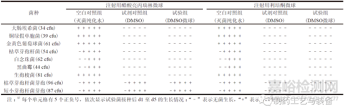 表2 DMSO 溶解注射用微球無菌檢查方法的適用性試驗(yàn)結(jié)果1)