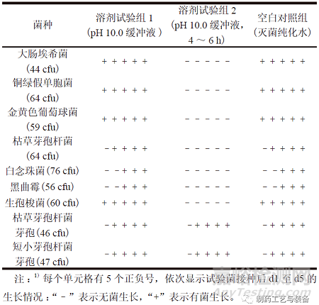 取“2.2”項(xiàng)下pH 10.0 緩沖液適量,依照ChP2020 通則1101,分別加入不大于100 cfu 的各試驗(yàn)菌,混勻。將含有大腸埃希菌、銅綠假單胞菌、金黃色葡萄球菌和生孢梭菌的混合溶液轉(zhuǎn)移至FTM培養(yǎng)基50 ml 中,于33 ℃培養(yǎng)不少于5 d ;將含有枯草芽孢桿菌、白念珠菌、黑曲霉、枯草芽孢桿菌芽孢和短小芽孢桿菌芽孢的混合溶液轉(zhuǎn)移至TSB培養(yǎng)基50 ml 中,于23 ℃培養(yǎng)不少于5 d。同時(shí),為確證pH 10.0 緩沖液中試驗(yàn)菌株的穩(wěn)定性,另取適量pH 10.0 緩沖液,加入試驗(yàn)菌后,置45 ℃、120 r/min 的恒溫?fù)u床中孵育4 ~ 6 h,然后分別轉(zhuǎn)移至不同培養(yǎng)基,觀察菌株生長情況。將上述采用新鮮配制pH 10.0 緩沖液的試驗(yàn)組作為溶劑試驗(yàn)組1,采用經(jīng)孵育4 ~ 6 h 的pH 10.0 緩沖液的試驗(yàn)組作為溶劑試驗(yàn)組2。