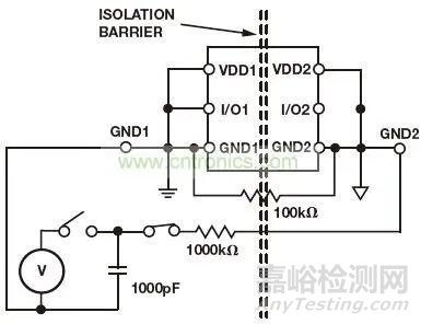 測(cè)試時(shí),把設(shè)備放在一個(gè)測(cè)試板上,使隔離柵兩端的所有引腳短路(見圖2)。將一個(gè)高壓脈沖發(fā)生器通過一個(gè)1000 /1000 pF網(wǎng)絡(luò)連接到隔離柵的一端。發(fā)生器回路連接到隔離柵另一端。將一個(gè)100 k、2.5 W的電阻跨接于隔離柵上,以便施加各個(gè)脈沖之后使電路放電。用一個(gè)帶1000:1高壓探頭的示波器監(jiān)控脈沖。將放電槍設(shè)置為測(cè)試計(jì)劃規(guī)定的最低電壓,示波器設(shè)為單次觸發(fā)。在該電壓電平下施加10個(gè)脈沖,并用示波器對(duì)各個(gè)脈沖進(jìn)行監(jiān)控。通過驟降脈沖幅度(在不到50 s的時(shí)間內(nèi)下降到50%)可發(fā)現(xiàn)隔離柵中的缺口。如果部件可以承受10個(gè)脈沖,則提高放電槍電壓,再施加10個(gè)脈沖。持續(xù)進(jìn)行,直到隔離柵發(fā)生故障為止,或者直到達(dá)到最大測(cè)試電壓為止。