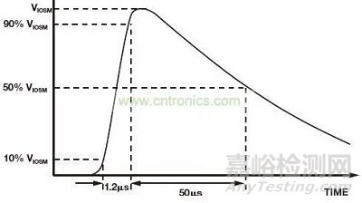 數(shù)字隔離器的浪涌電壓額定值規(guī)定的是在經(jīng)受連續(xù)短暫高壓脈沖之后的抗沖擊能力。圖1所示為符合IEC 61000-4-5的浪涌波形的時(shí)序特性。