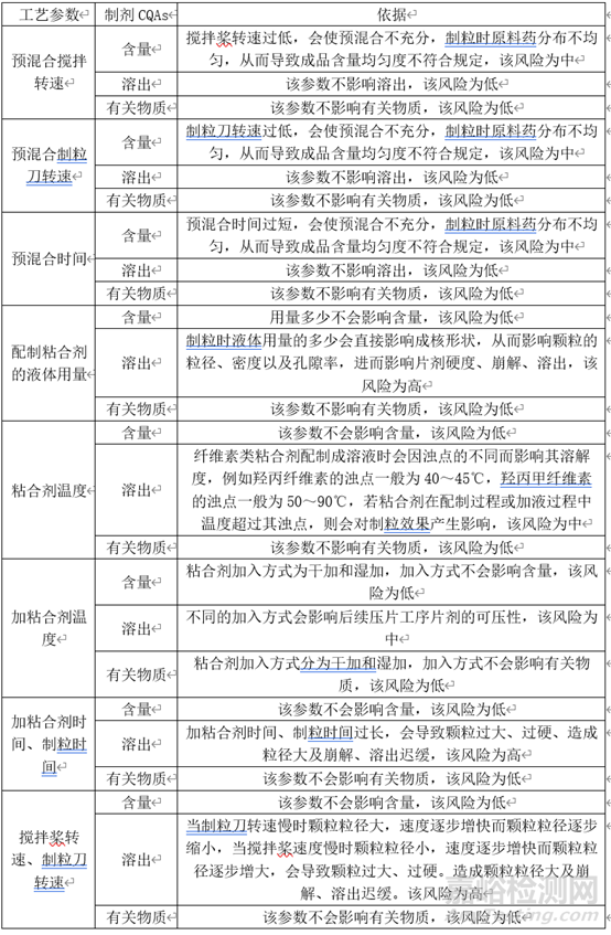 表5:濕法制粒工藝工藝參數(shù)風(fēng)險(xiǎn)評估的理由