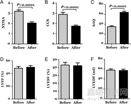 注:紐約心臟協(xié)會(huì)(NYHA )分級(jí)、加拿大心血管協(xié)會(huì) (CCS) 心絞痛量表和西雅圖心絞痛問卷 (SAQ) 。經(jīng)胸超聲心動(dòng)圖檢測(cè)左心室射血分?jǐn)?shù)(LVEF)、左心室舒張末期容積(LVEDV)和左心室收縮末期容積(LVESV)。