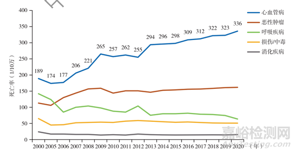 圖表20 2000—2020年中國(guó)農(nóng)村居民主要疾病死亡率變化