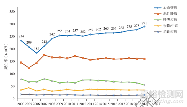 圖表21 2000—2020年中國(guó)城市居民主要疾病死亡率變化