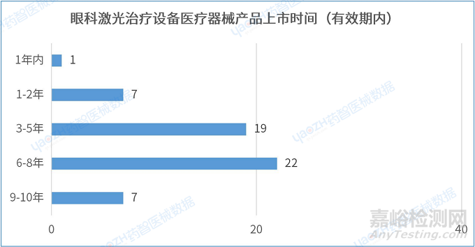 據(jù)統(tǒng)計(jì),從產(chǎn)品進(jìn)入市場的平均時間來看,有效期內(nèi)的眼科激光治療設(shè)備醫(yī)療器械產(chǎn)品的上市時間在6-8年的產(chǎn)品數(shù)量最多,有22件。