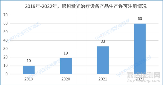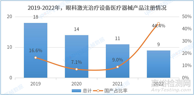 從產(chǎn)品注冊情況來看,2019-2022年注冊數(shù)量總體呈下降趨勢,2019年產(chǎn)品注冊數(shù)量最多,四年國產(chǎn)化率在19.2%左右,其中有效期內(nèi)首次注冊眼科激光治療設(shè)備醫(yī)療器械占25%。