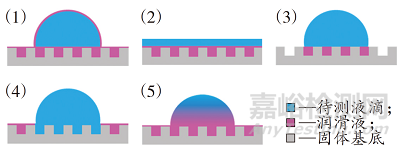 (1)潤滑液的表面能過低,會包裹污染液滴形成遮蔽效應(yīng),從而使得潤滑液快速消耗;(2)潤滑液的表面能較高,使得污染液滴在其表面鋪展開來,因此不能變?yōu)樾∫旱味?;?)潤滑液未能完全浸潤粗糙的涂層基體,從而在未浸潤部位發(fā)生釘扎現(xiàn)象;(4)外界流體對基體的浸潤性更好,從而替換掉潤滑液而發(fā)生釘扎現(xiàn)象;(5)潤滑液與外界流體互溶。