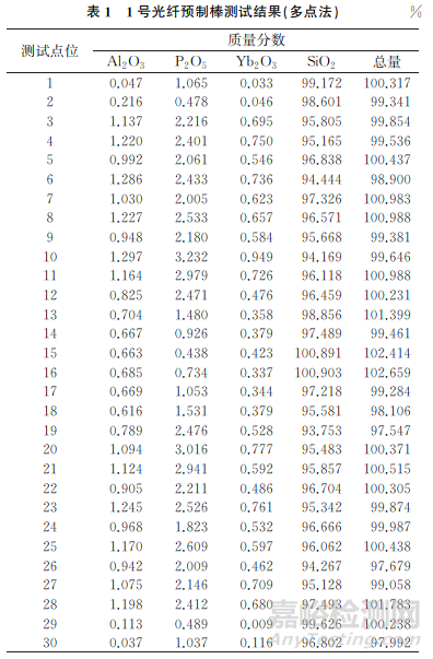 利用電子探針顯微分析儀對(duì)光纖預(yù)制棒進(jìn)行元素線分析定量化,將多點(diǎn)法測試結(jié)果作為定量化結(jié)果準(zhǔn)確性的評(píng)判依據(jù),并將其與靈敏度曲線法和兩點(diǎn)法的測試結(jié)果進(jìn)行比較,同時(shí)考慮試樣基體效應(yīng)的影響,從而在兩點(diǎn)法的基礎(chǔ)上引入修正因子,得到了準(zhǔn)確的元素線分析定量化結(jié)果。