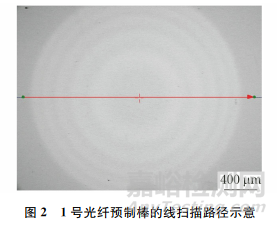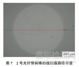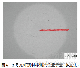采用多點(diǎn)法在2號(hào)光纖預(yù)制棒的直徑方向進(jìn)行測試,測試位置如圖6所示;沿2號(hào)光纖預(yù)制棒的直徑方向進(jìn)行線掃描分析,線掃描的路徑如圖7所示。將2號(hào)光纖預(yù)制棒中Al元素的測試結(jié)果代入圖4的曲線中,結(jié)果如圖8所示,可見采用兩點(diǎn)法與多點(diǎn)法測得的Al元素含量基本一致。