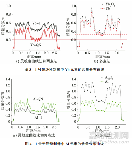 由圖3,4可知:靈敏度曲線法與多點(diǎn)法測得的Yb、Al元素含量相差較大;兩點(diǎn)法與多點(diǎn)法測得的Al元素含量較一致,Yb元素含量相差較大。Yb元素為稀土元素,原子序數(shù)較大,需要較高的加速電壓對(duì)其進(jìn)行激發(fā),且受高能電子束激發(fā)后,Yb元素產(chǎn)生的特征X射線比較復(fù)雜。為了充分考慮光纖預(yù)制棒中多數(shù)元素的最佳電壓,選擇15kV作為1號(hào)光纖預(yù)制棒試樣的激發(fā)電壓,導(dǎo)致Yb元素的測試結(jié)果受到影響。此外,Yb元素的含量較低,基體效