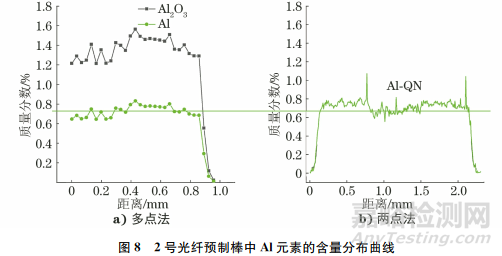 沿1號(hào)光纖預(yù)制棒的直徑方向進(jìn)行線掃描,線掃描的路徑如圖2所示。采用靈敏度曲線法,將線掃描結(jié)果代入儀器自帶的內(nèi)建標(biāo)準(zhǔn)曲線,得到Y(jié)b元素的含量分布曲線Yb-1[見圖3a)];采用兩點(diǎn)法得到自定義的工作曲線,然后將線掃描結(jié)果代入該曲線,得到Y(jié)b元素的含量分布曲線 Yb-QN[見圖3a)];將多點(diǎn)法進(jìn)行修正,得到Y(jié)b2O3的含量分布曲線[見圖3b)],然后將Yb2O3的含量轉(zhuǎn)化為Yb元素的含量,得到 Yb元素的含量分布曲線[見圖3b)]。采用靈敏度曲線法、兩點(diǎn)法、多點(diǎn)法得到1號(hào)光纖預(yù)制棒中Al元素的含量分布曲線如圖4所示。